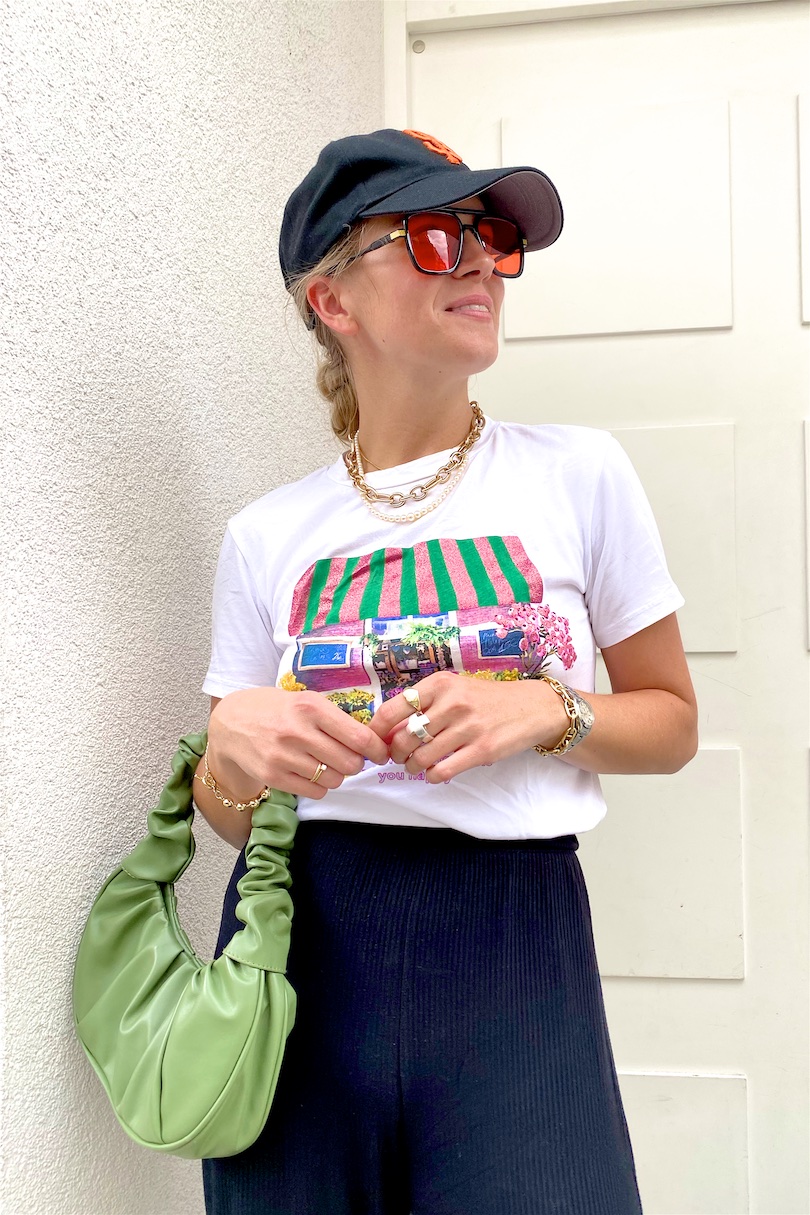 The green and orange details go so well together. I like how the colors get repeated in the whole look, for example the green of the bag in the graphic tee. My favorite part though is how the jewelry and the ruched bag compliment this sporty look by adding some femininity.
