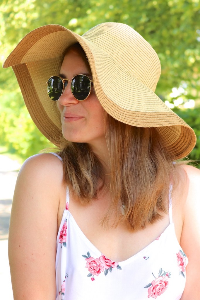 Details for Floral Summer Dress: Floral Summer Dress, Floppy Straw Hat (similar here and here), Ray-Ban Sunglasses, Straw Bag (similar here), Golden Sandals (similar here and here)