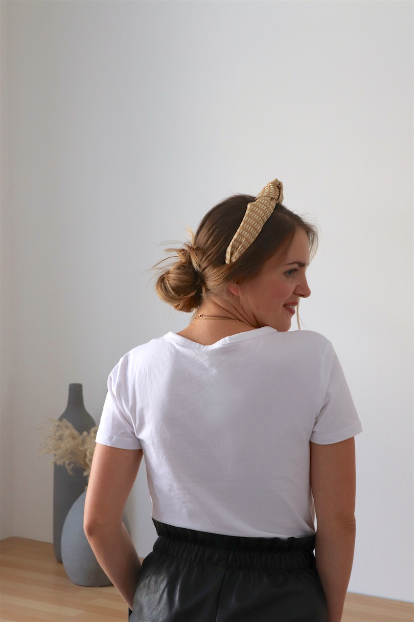 The third look is a simple low, messy bun. I always do a ponytail with a thicker hair bobble and don’t pull the hair all the way through (as I would if creating a ponytail). You actually create a loop with your hair. Then I arrange the hair so it still looks messy and effortless and fix everything with hairpins. At the end make sure you pull out some strands again and put on your headband and you’re done!