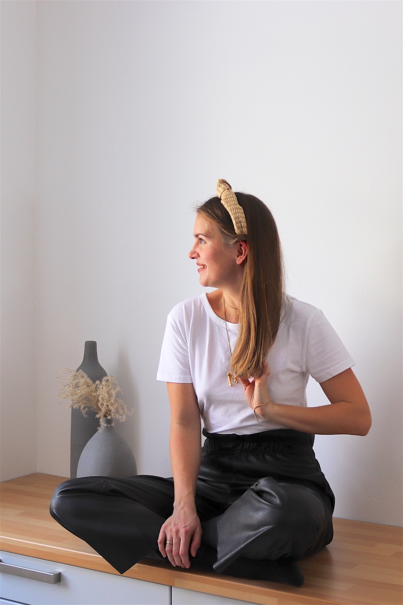 Outfit Details for Headband Hairstyle: Straw Headband (similar here and here), White T-Shirt, Leather Culottes
