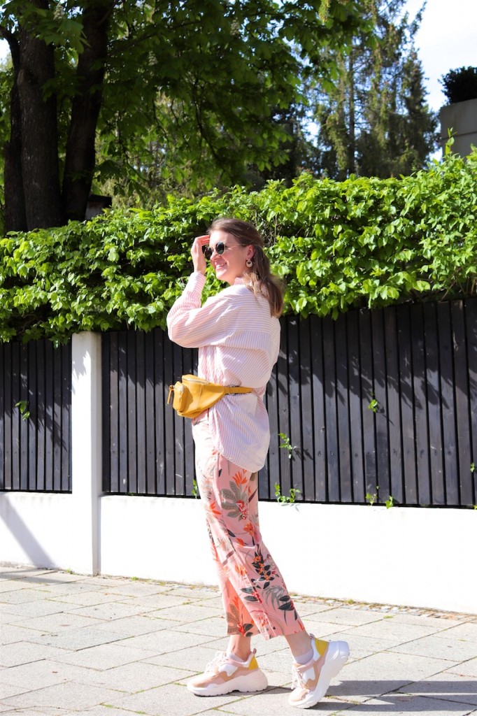 Outfit Details for Tropical Flowers: Pants with Tropical Flowers (similar here and here), Striped Shirt, Pink Hair Clip (similar here), Ray-Ban Sunglasses, Earrings, Yellow Belt Bag (similar here), Chunky Sneakers (similar here and here)